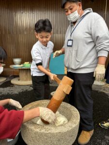 臼と杵使った餅つきに興味津々で参加し